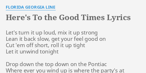 Heres to the good times by florida georgia line with lyrics on screen feel free to leave comments about any mistakes in the vid or about anythinglike li. Heres to the good times heres to the sunshine heres to the ice you float your beer in to the tops you pop and the tan lines disappearin oh my my shes a little bit tipsy leans in for a kiss shes stealin your heart just like a gypsy and there you are just a drunken star just fallin in her eyes heres to the good times. Lyrics to heres to the good times by florida georgia line.