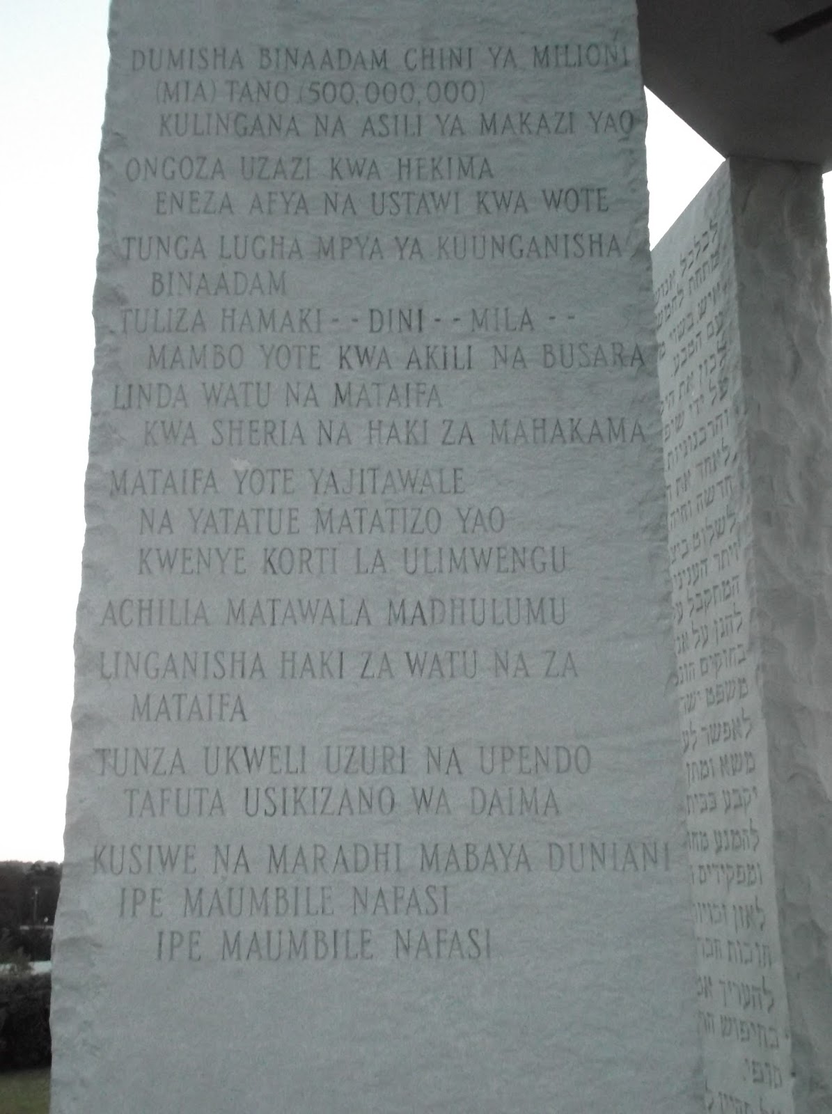 Let these be guidestones to an age of reason. English spanish swahili hindi hebrew arabic traditional chinese and russian. Moving clockwise around the structure from due north these languages are.