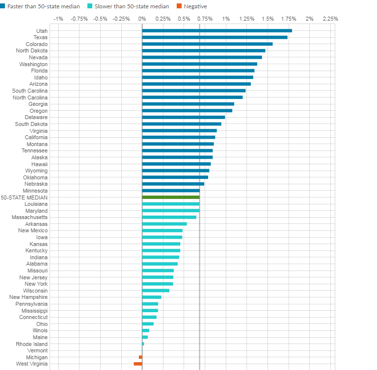 Georgia population growth rate. Derived from total population. Median value of owner occupied housing units 2014 2018. With the 10th fastest growth rate of 119 the population of georgia first surpassed 10 million residents in 2013.