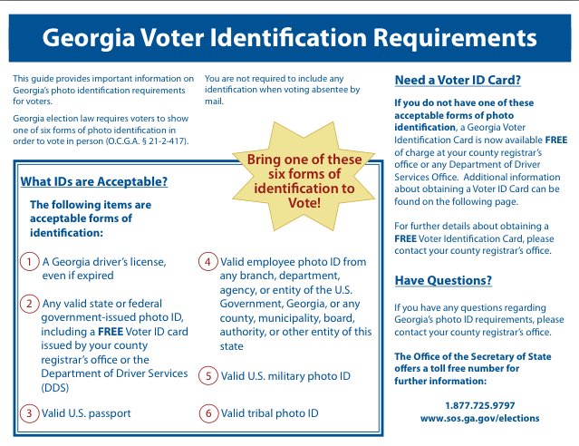Use this interactive map to learn if you need to bring a photo id when you vote. Georgia requires that all would be voters to have some form of qualifying identity card to actually cast their votes. Employee photo id issued by the us government georgia government or any county municipality board authority or other georgia government entity.